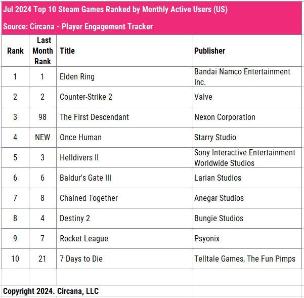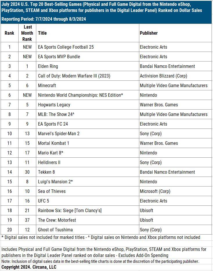 Here are the top 20 best-selling games in terms of dollars for July 2024:
