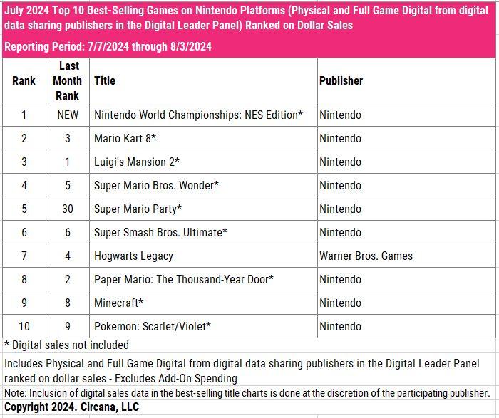 Nintendo World Championships: NES Edition was the only other new release in the top 20. It debuted in sixth place on the overall charts for July 2024 and in first on the Nintendo Switch charts.