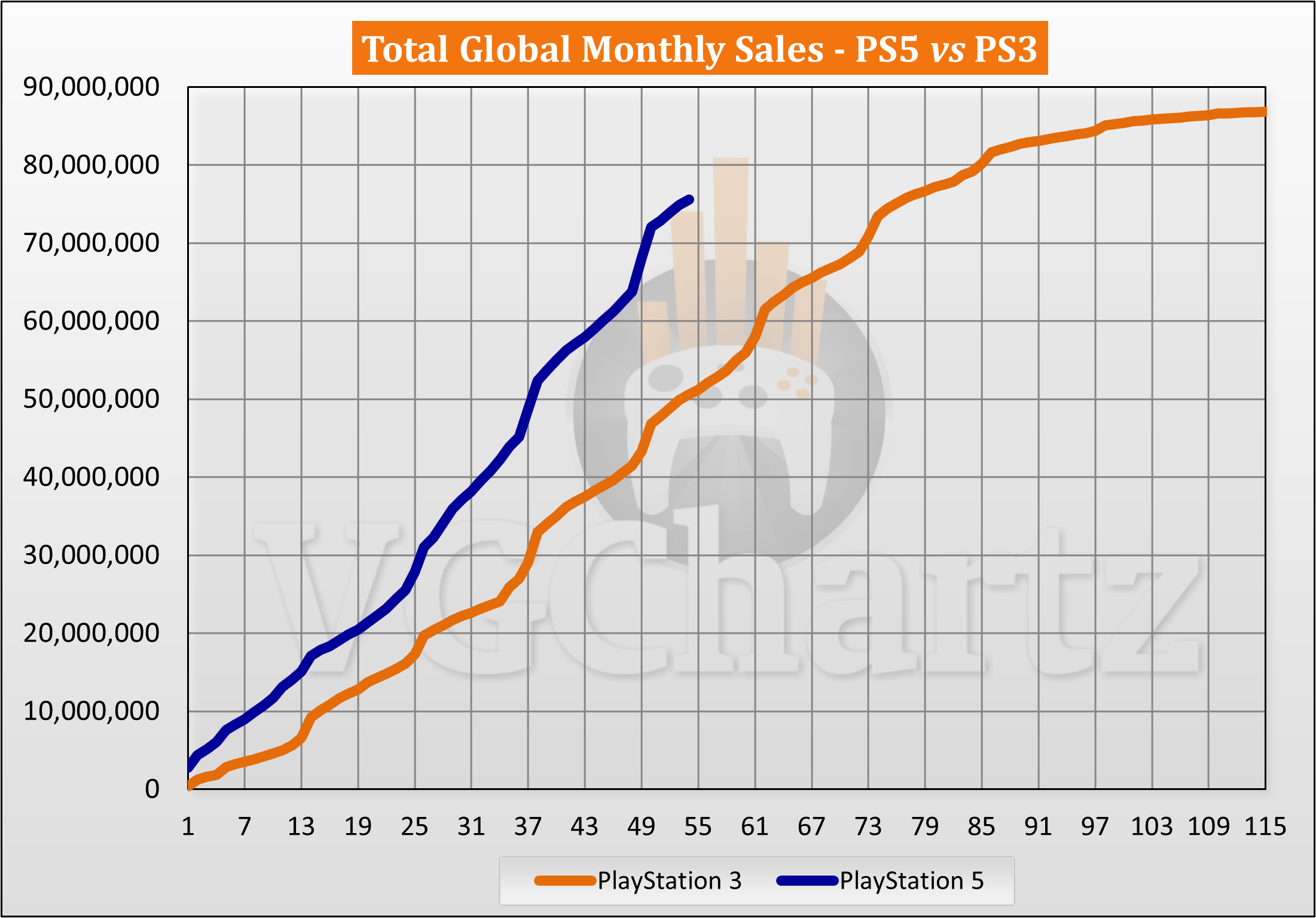This monthly series compares the aligned worldwide sales of the PlayStation 5 and PlayStation 4.