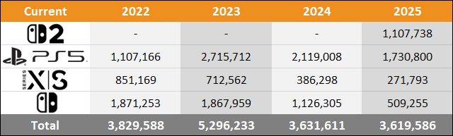 PlayStation 5 sales compared to the same month a year ago are down by 159,512 (-14.8%). Xbox Series X|S sales are down by 151,836 units (-49.1%) and Nintendo Switch 1 sales are down by 449,823 units (-58.7%).