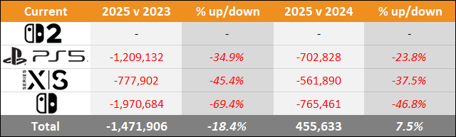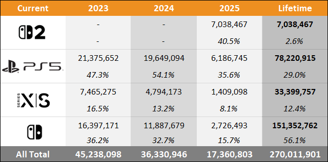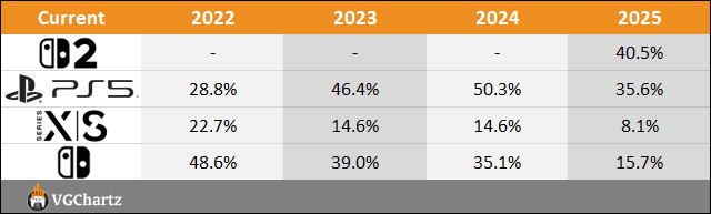 Here we see data representing the sales through to consumers and change in sales performance of the four current platforms (Nintendo Switch 2, PlayStation 5, Xbox Series X|S, and Nintendo Switch 1) over comparable periods for 2022, 2023, 2024, and 2025. Also shown is the market share for each of the consoles over the same periods.