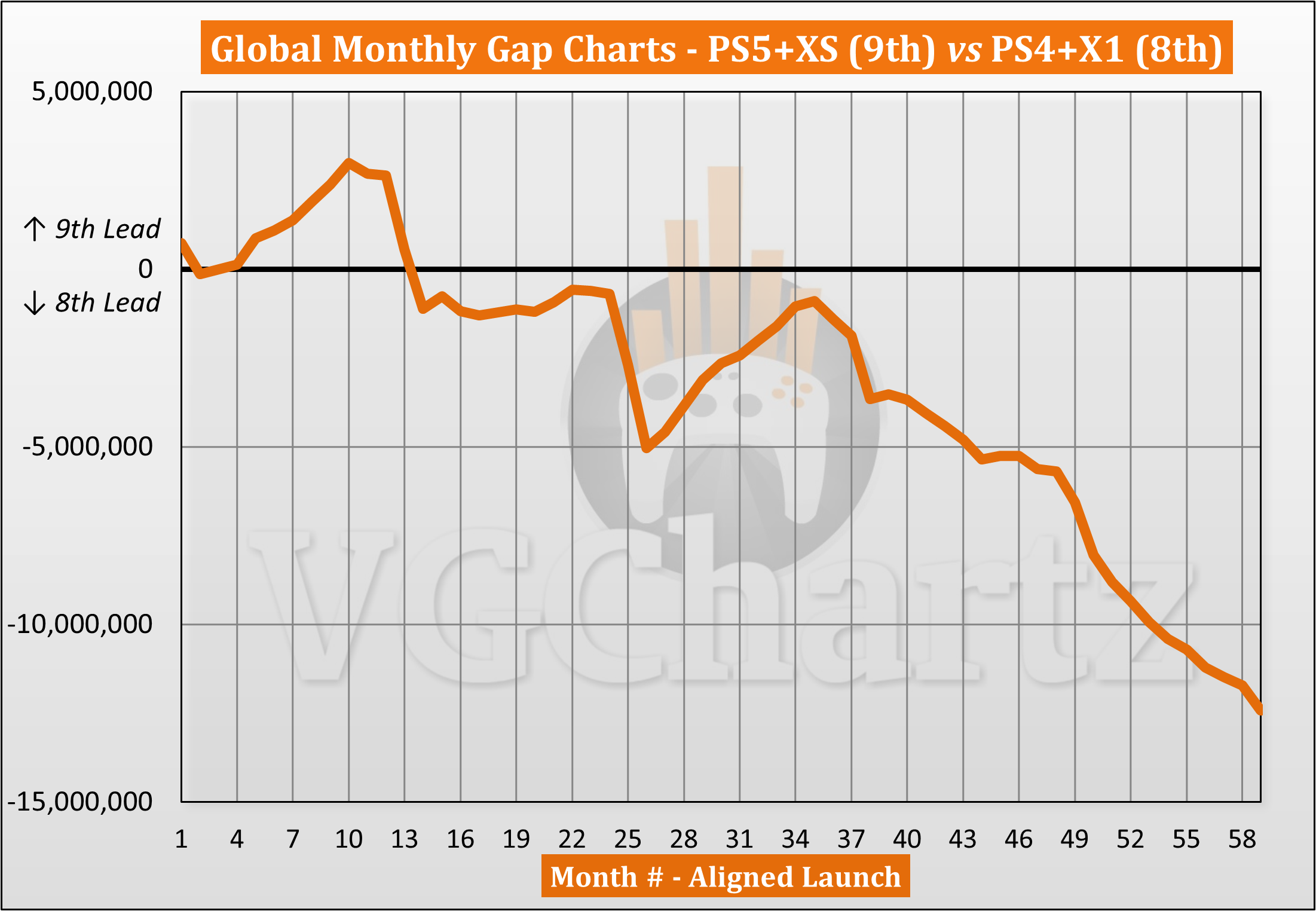The PlayStation 5 is currently 3.55 million units behind the PlayStation 4 when you align launches and the Xbox Series X|S is behind the Xbox One by 8.87 million units.