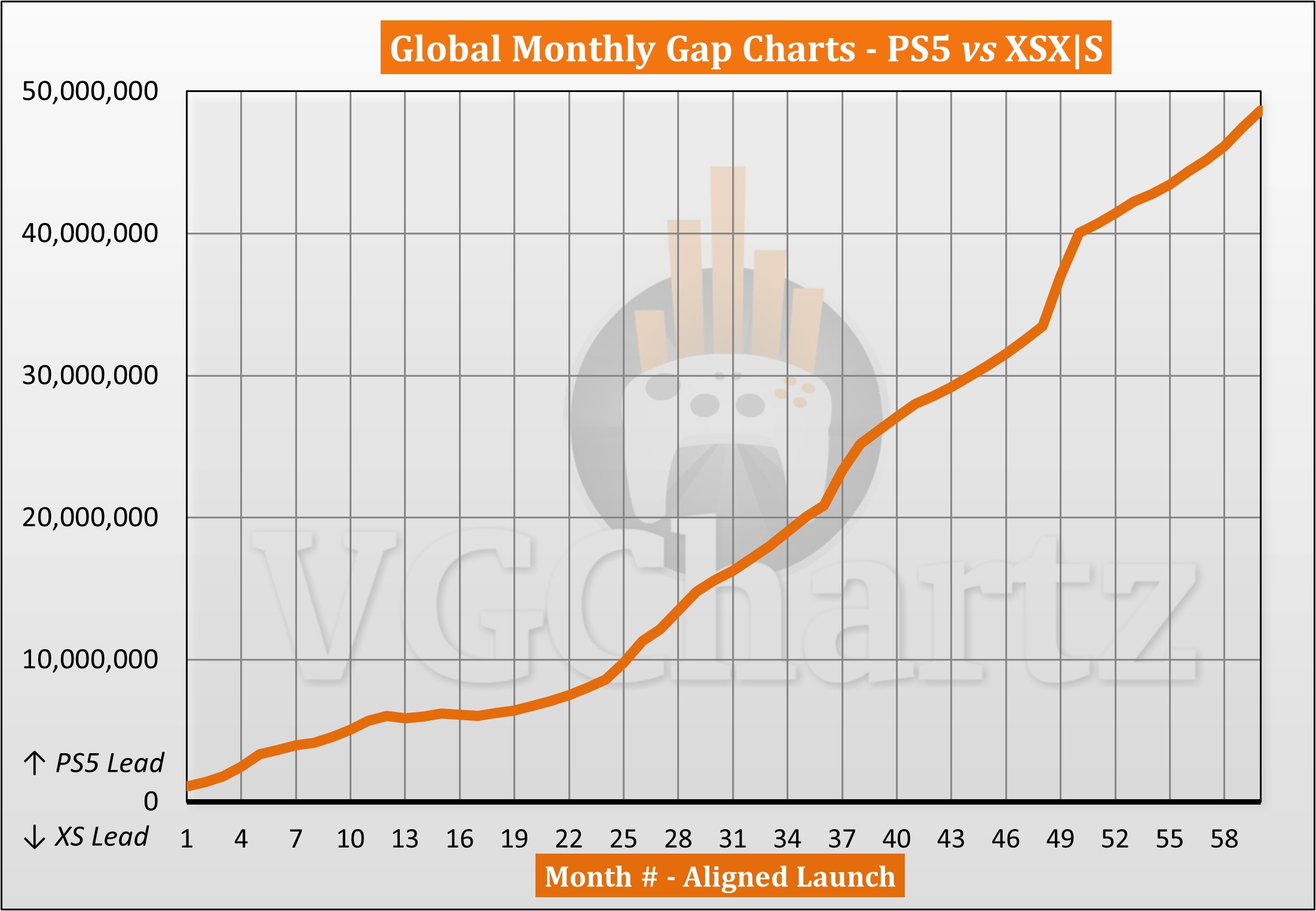 This monthly series compares the aligned worldwide sales of the PlayStation 5 and Xbox Series X|S.