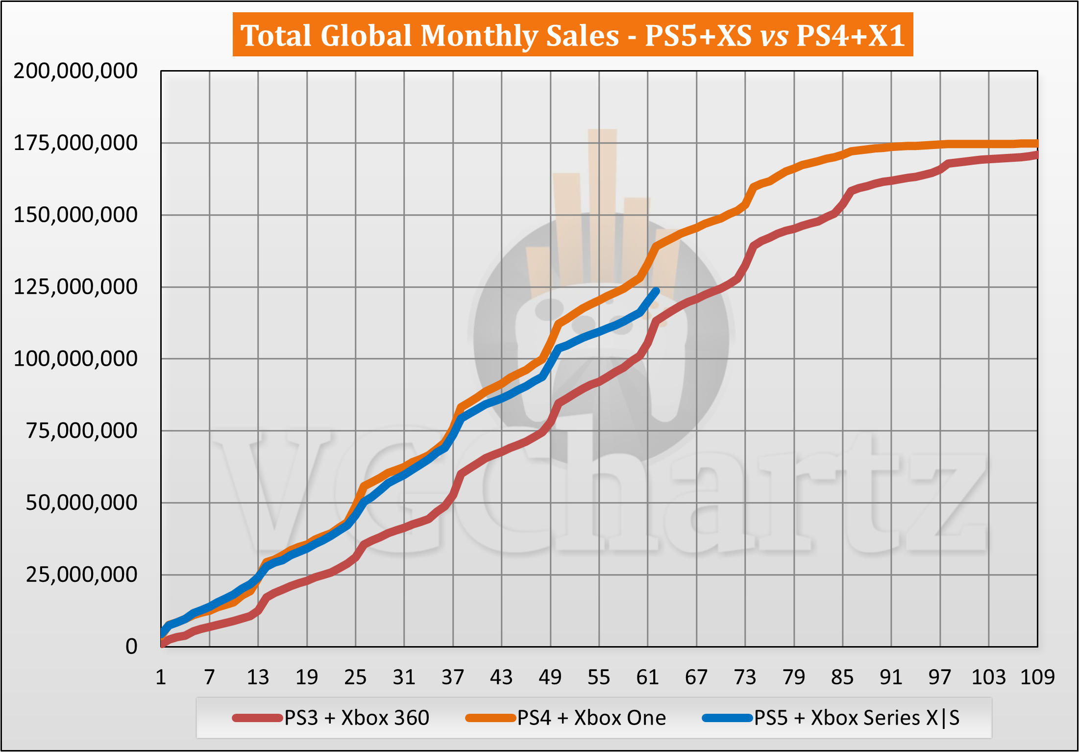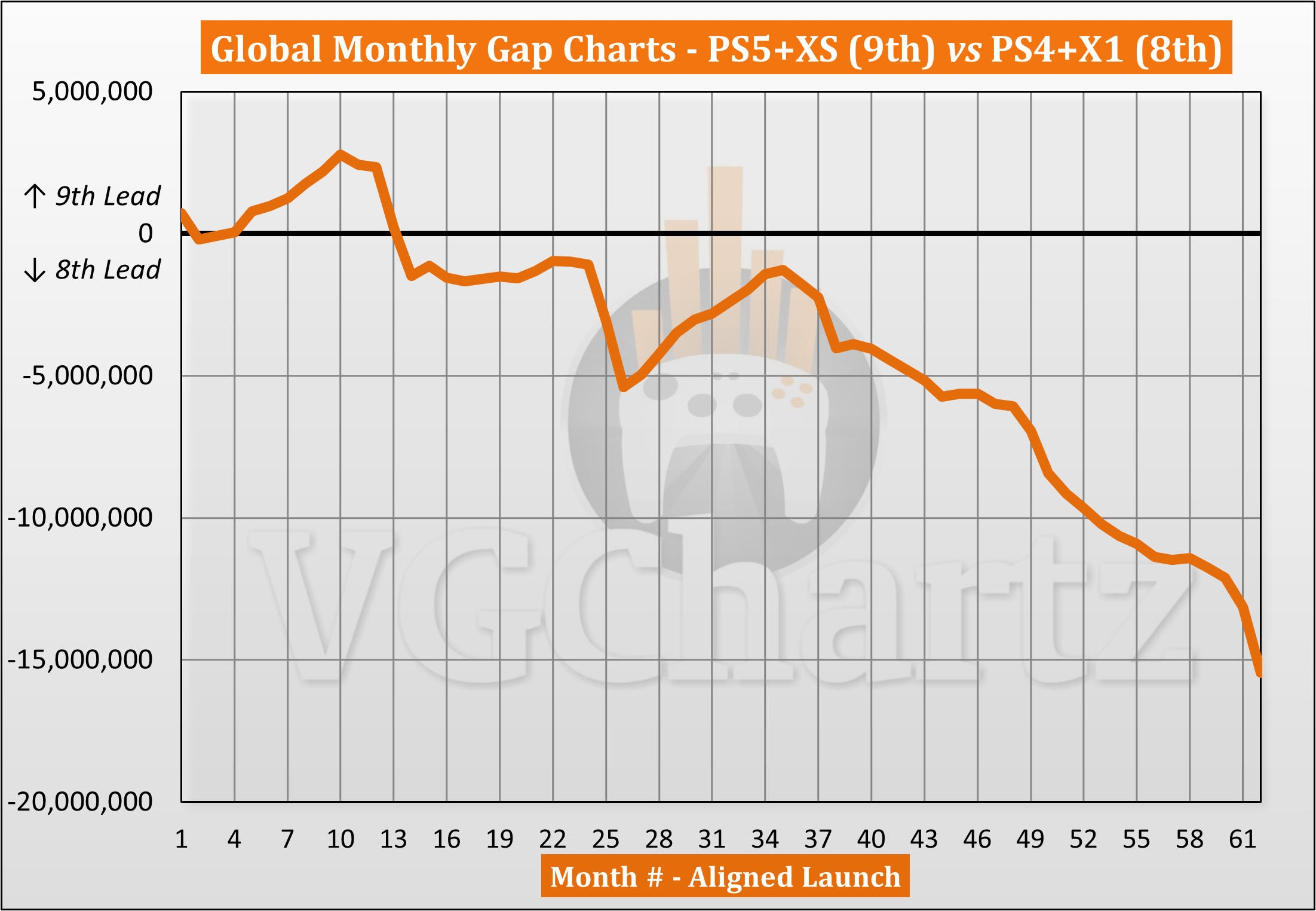 This monthly series compares the aligned worldwide sales of the PlayStation 5 and PlayStation 4.