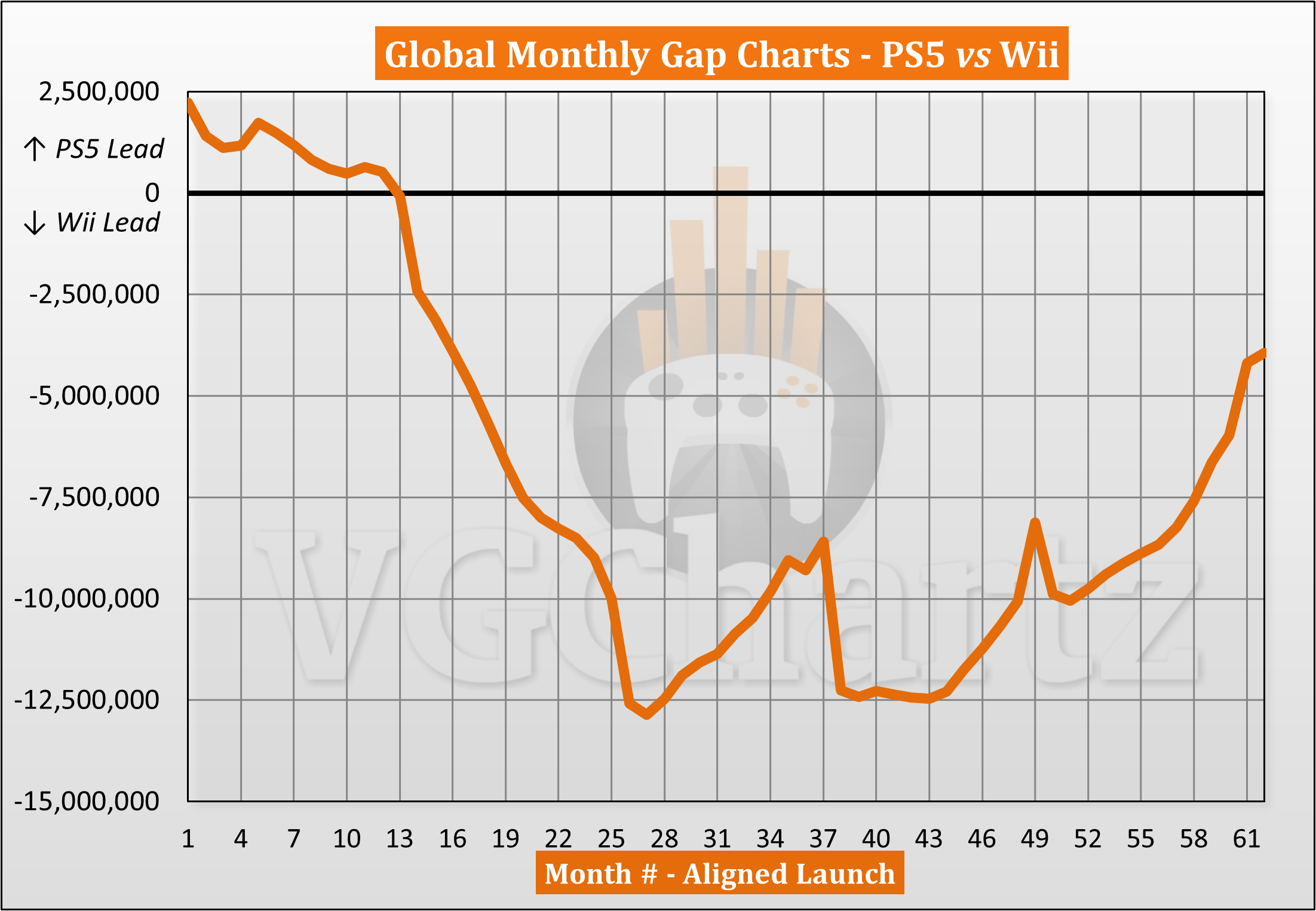 This monthly series compares the aligned worldwide sales of the PlayStation 5 and Wii.
