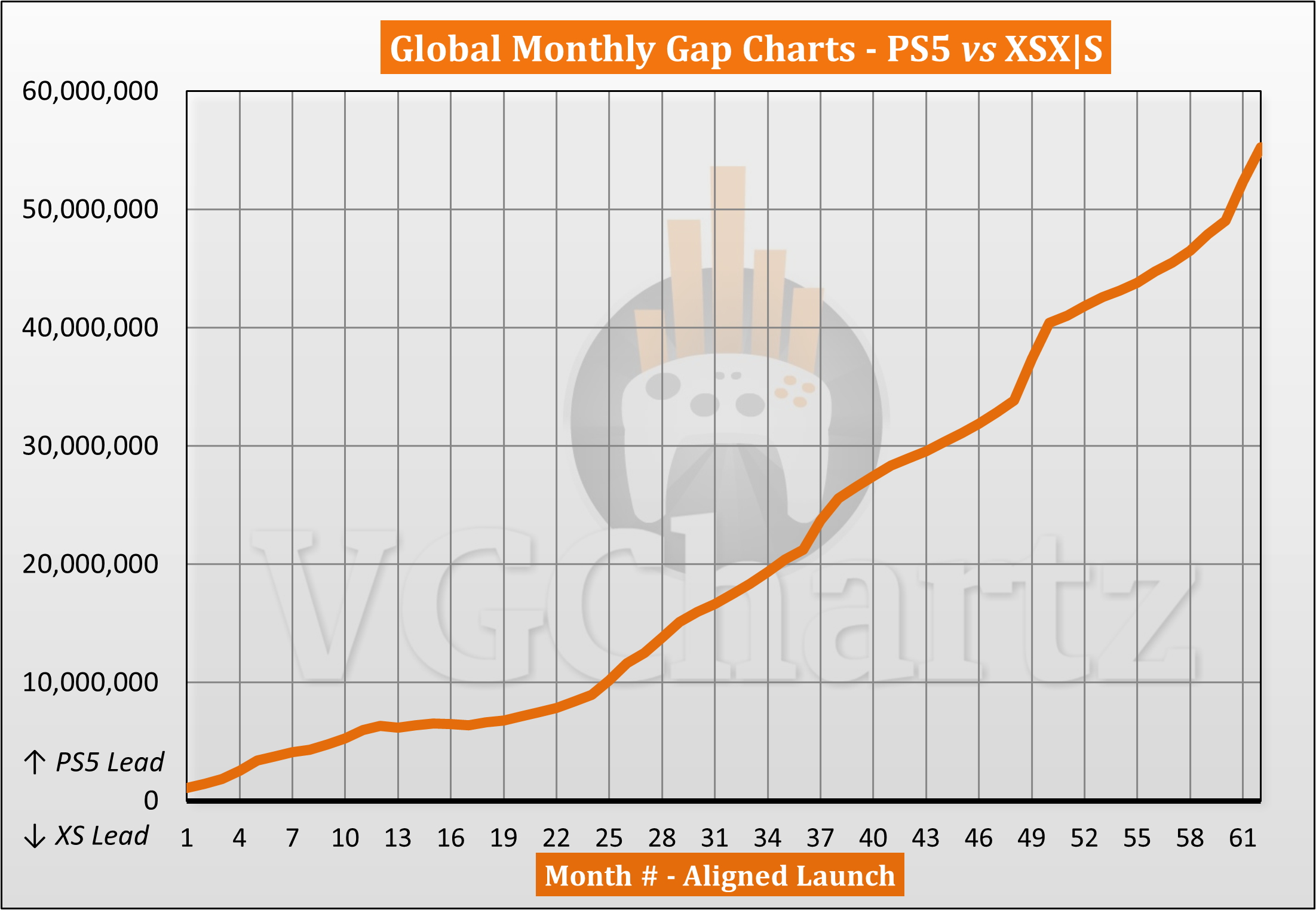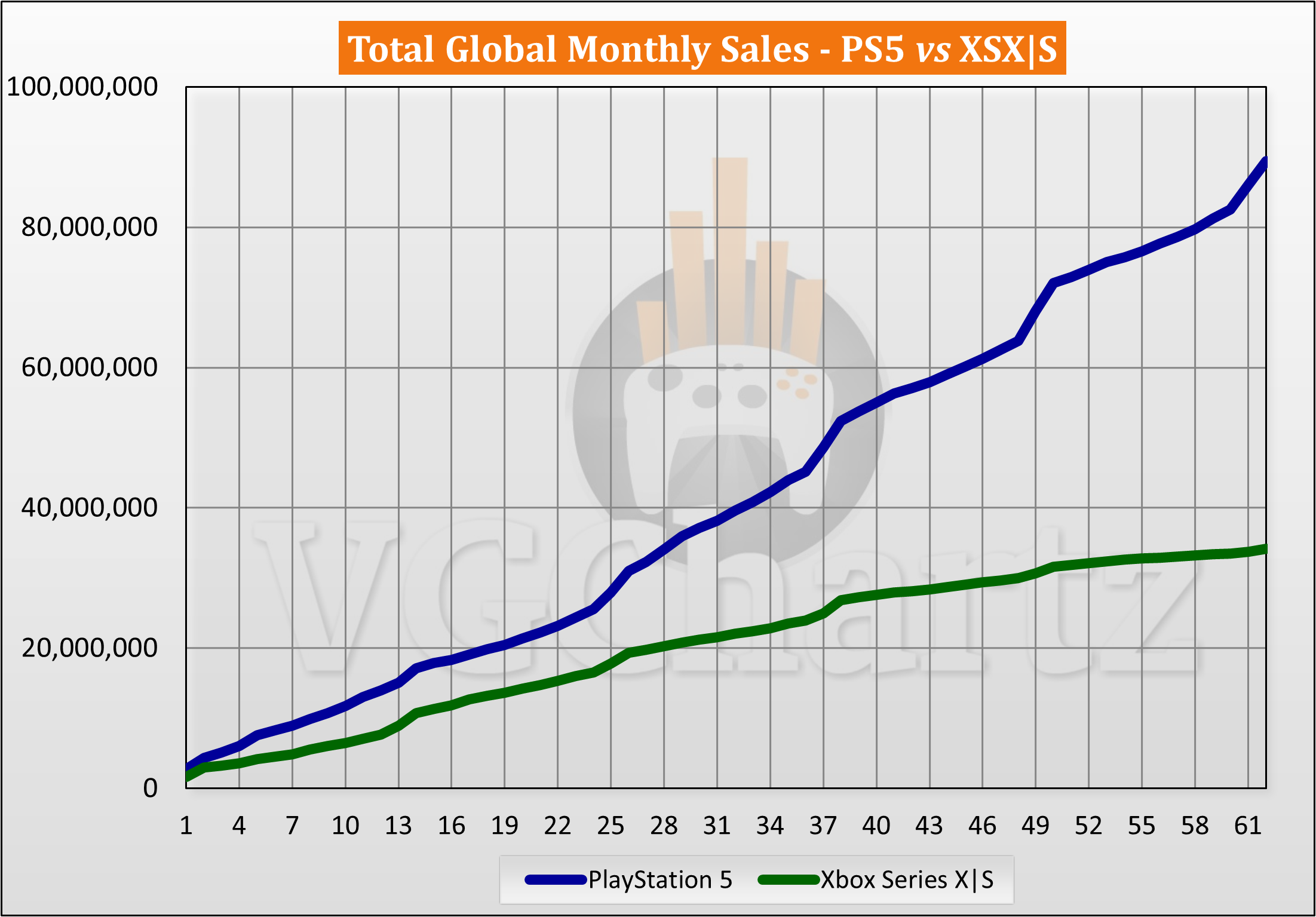 This monthly series compares the aligned worldwide sales of the PlayStation 5 and Xbox Series X|S.
