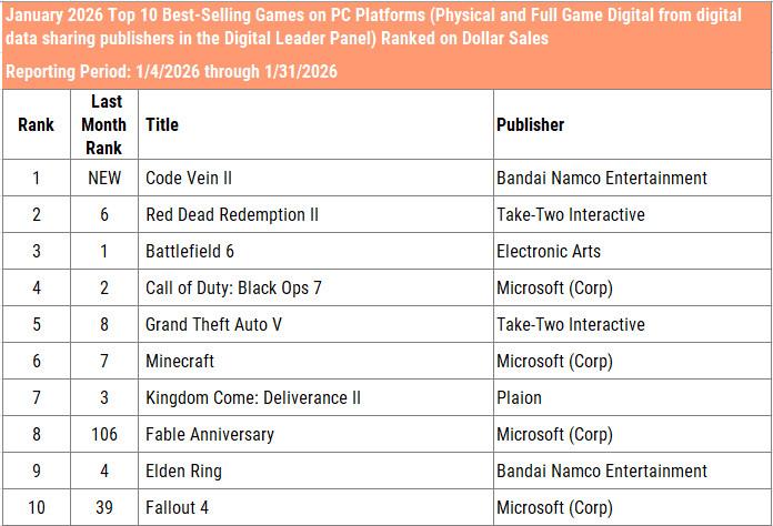 Code Vein 2 debuted in 11th place and was the only new release to debut in the top 20 for the month of January. It was the best-selling game on PC.