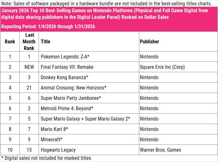 Here are the top 10 best-selling premium games on Nintendo platforms in January 2026: