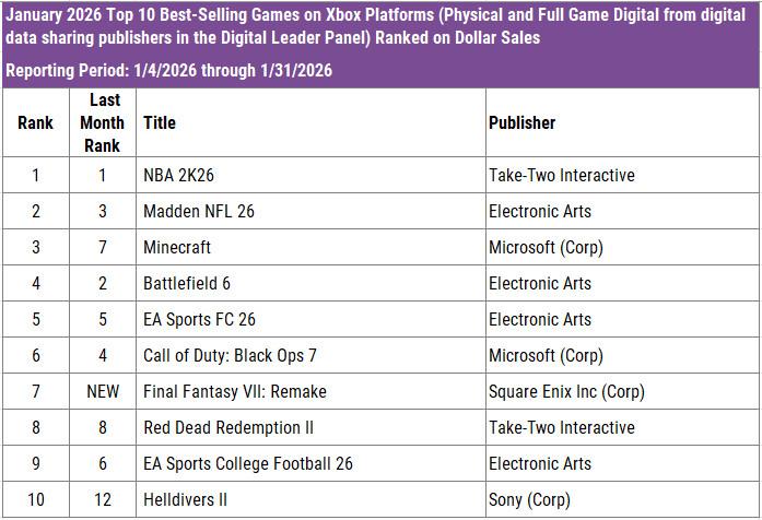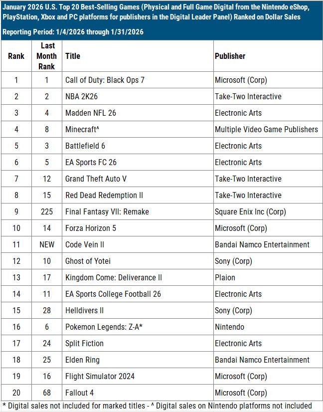 Here are the top 20 best-selling games in terms of dollars for January 2026: