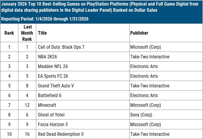 Here are the top 10 best-selling premium games on PlayStation platforms in January 2026:
