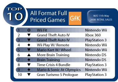 Grand Theft Auto IV for the Xbox 360 is at number two, whereas the PS3 version trails behind at number three for the week of May 5 to May 11. Wii Play has retained its spot in fourth from the previous week, but Mario Kart Wii fell two places to number five. Nintendo's popular Dr Kawashima's Brain Training: How Old Is Your Brain? franchise lay claim to both the sixth and seventh positions, respectively. Namco's light-gun shooter for the PS3, Time Crisis 4, has fallen to number eight. Mario & Sonic at the Olympic Games on the Wii is more than acquainted with the chart and has managed to maintain its hold over the ninth spot. The last game to make it into the charts is Gran Turismo 5 Prologue at number 10.