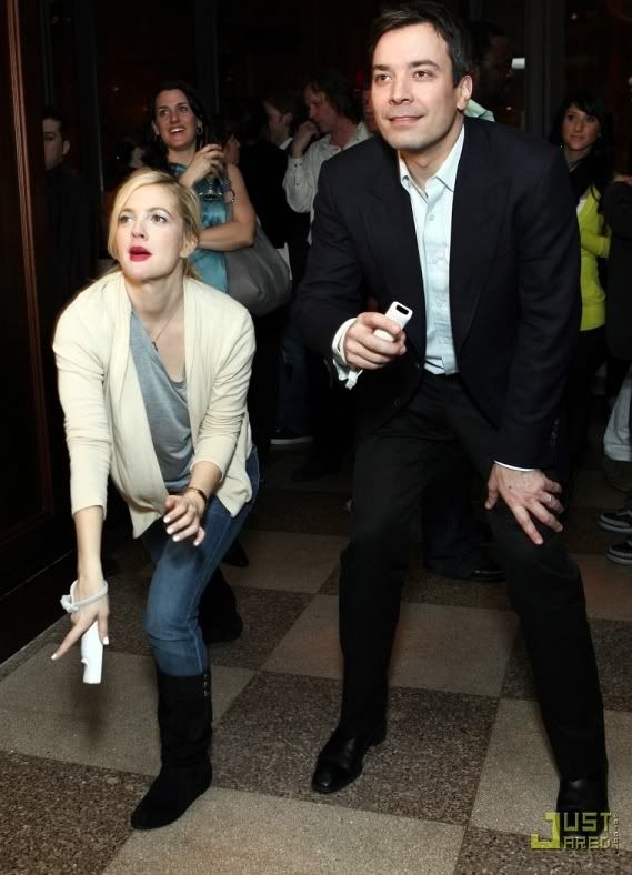 Jimmy Fallon had Drew Barrymore as a guest on Late Night With Jimmy Fallon. To celebrate his first week on the air, Drew Barrymore has some late night Wii fun with Jimmy Fallon and friends at Center Cut restaurant in midtown.