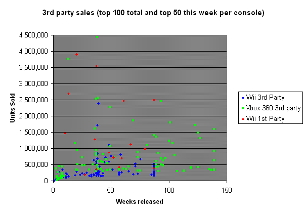 No matter how you slice it though, considering that the Xbox 360 had a year's head start on the other platforms, the Wii's third-party sales are quite good.