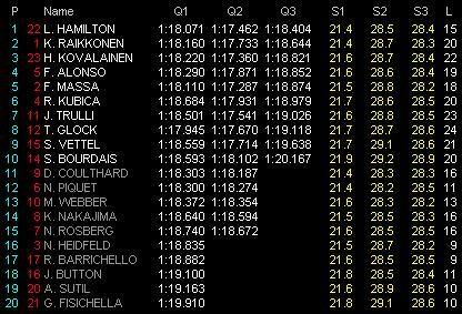 Great result for Hamilton and bad for Massa, it's Lewis chance to get a nearly-definitive lead over Felipe, which said he made a mistake in his flying lap, he could also br going in a different strategy. Great qualy for Alonso, also good for Kovalainen (if he starts well he could keep Massa from advancing).