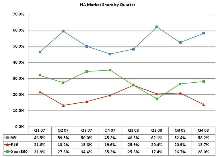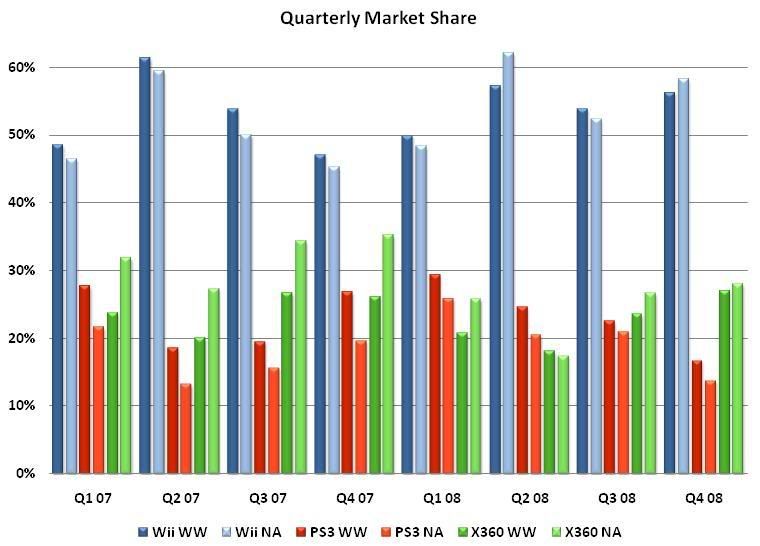 08 went as follows: weak Q1 (50%), strong Q2 (57%), moderate-weak Q3 (54%), and moderate-strong Q4 (56%). 07 followed the same trend with the exception of Q4 (47%), which was the Wii's worst quarter to date. In theory, the weak Q4 07 may be because Wii was supply constrained and could not meet the increased holiday demand, but I won't commit to that theory unless 09 ends up showing the same trend as 08.