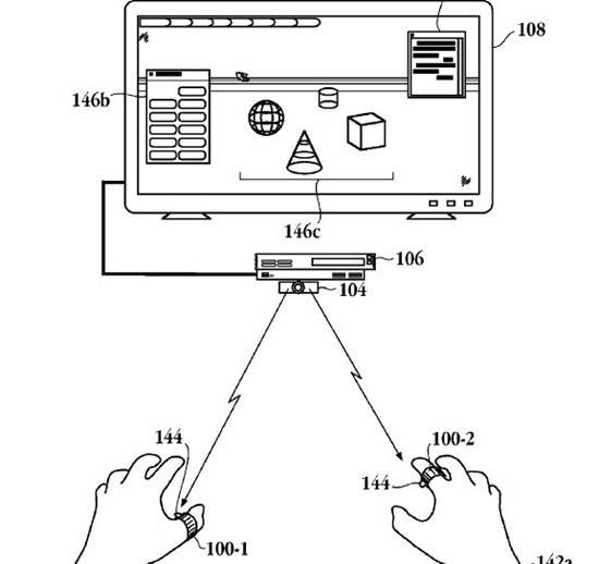 Another diagram shows a different device using the same variable color LED emitting technology. This hypothetical controller is designed to fit on a finger, radiates light from multiple LEDs, and has buttons on the side. Ring controllers… the future of video games?