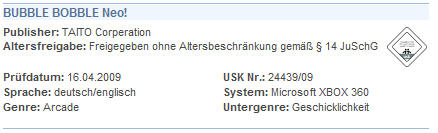 Taito brought a number of legacy franchises like Space Invaders and Arkanoid to Xbox Live Arcade. So, color me unsurprised when I discovered a rating for Bubble Bobble Neo! in Germany’s video game rating board.
