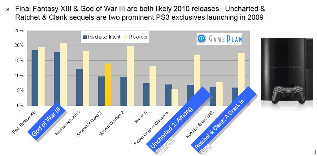 On PS3, Final Fantasy XIII fares a whole lot better — it has the highest purchase intent of any PS3 title. God of War 3 leads with pre-order intent. Also high on the list are Ratchet & Clank: A Crack In Time and Uncharted 2.