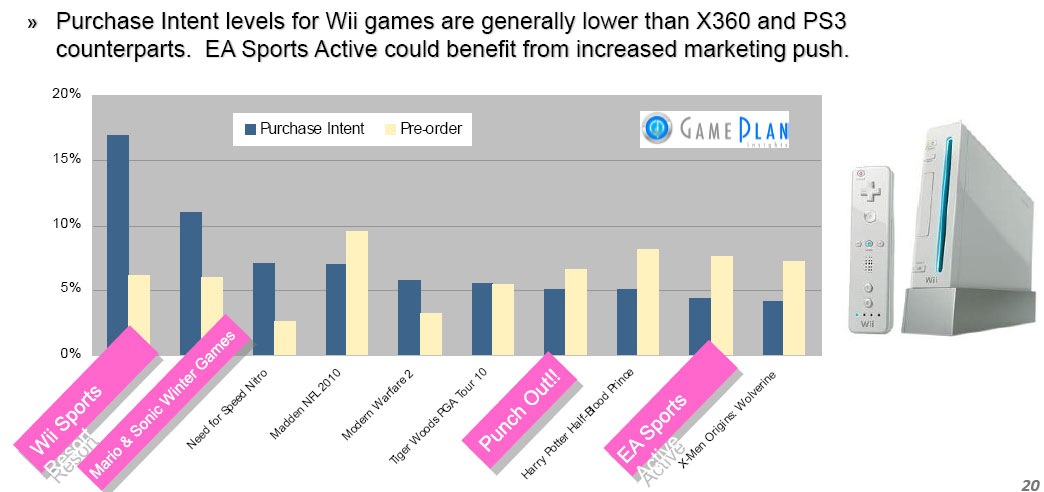 Wii gamers are by far most excited about Wii Sports Resort, according to OTX’s polling. That title has a very high purchase intent. Leading pre-orders is Madden NFL 2010. Mario & Sonic at the Winter Games is also highly anticipated, but nothing else is charting that high, including the new Punch Out! Williams explains that Wii owners are content with their current games, or are desperate for the games currently on the market, judging by eBay prices. On average, Wii Fit goes for $126 (MSRP - $89.99) and Mario Kart Wii goes for $66 (MSRP - $49.99).