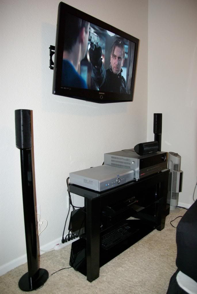 Here are my pictures for now. I took these as soon as I got the speakers setup, but it is a little better organized now. I'm trying to build a house now, so once I move I plan on upgrading my TV to something in the 50" range or possibly a projector and going to 80".
