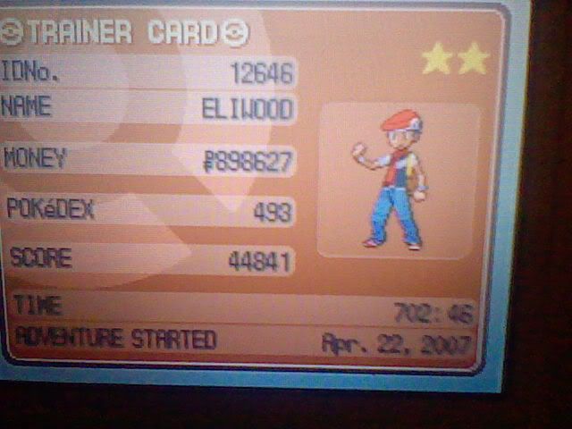 And I obtained all Pokemon through legit measures, except using the AR to get the event items for Darkrai, Shaymin, and Arceus. Manaphy was obtained through Pokemon Ranger. And I used Emerald as a cloning station from using Pokemon raised on Emerald and from Colosseum and XD: Gale of Darkness.