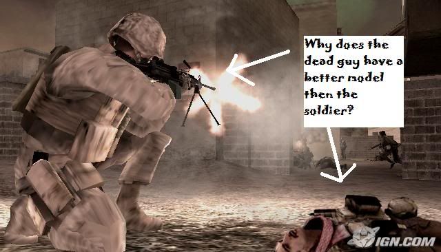 The terroist at the bottem has very nice textures and looks like it did in CoD4, the ground has nice textres, and so do the walls, but the soldier looks out of place, low poly, low rez, etc.