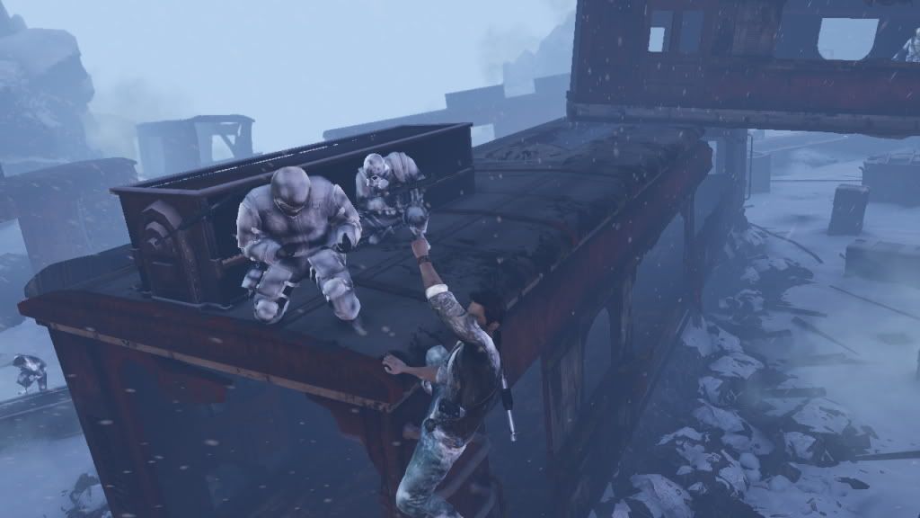 I also had a nice start, killing 1 guy with my shotgun, then pulling one guy off a train cart, and then killing 2 more up there! It was awesome