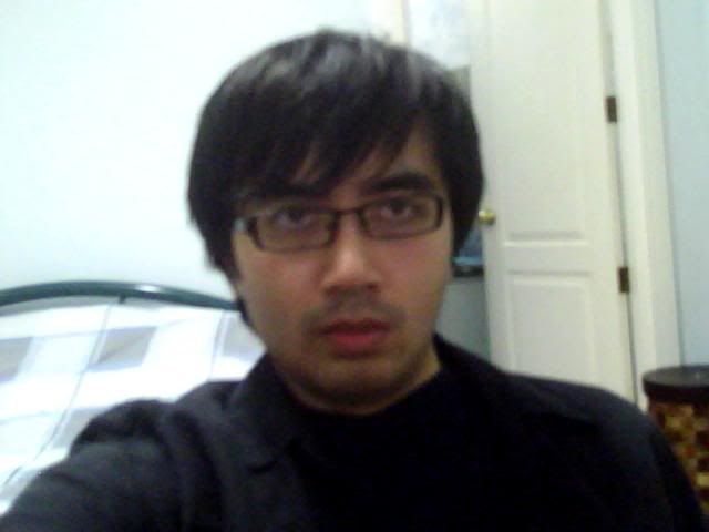 wait i'll take another picture. this damn webcam sucks. gimme 15 minutes. eyes slightly closed and hair parted in middle. got it.