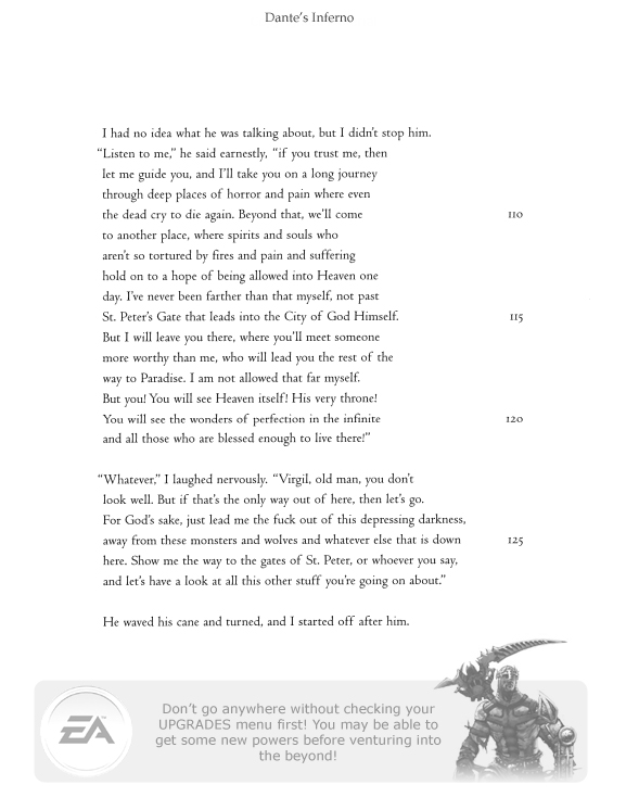 I am overflowing with emotions in every direction and can barely respond! This is hilarious and confusing and scary and awesome all at once! I never thought I'd see any classic political poetry with an EA logo, some stupid hardcore badass game art, and a hint about checking my UPGRADES menu! Has the whole world gone to Hell or is this another of EA's brilliant Nine Circles of Marketing?